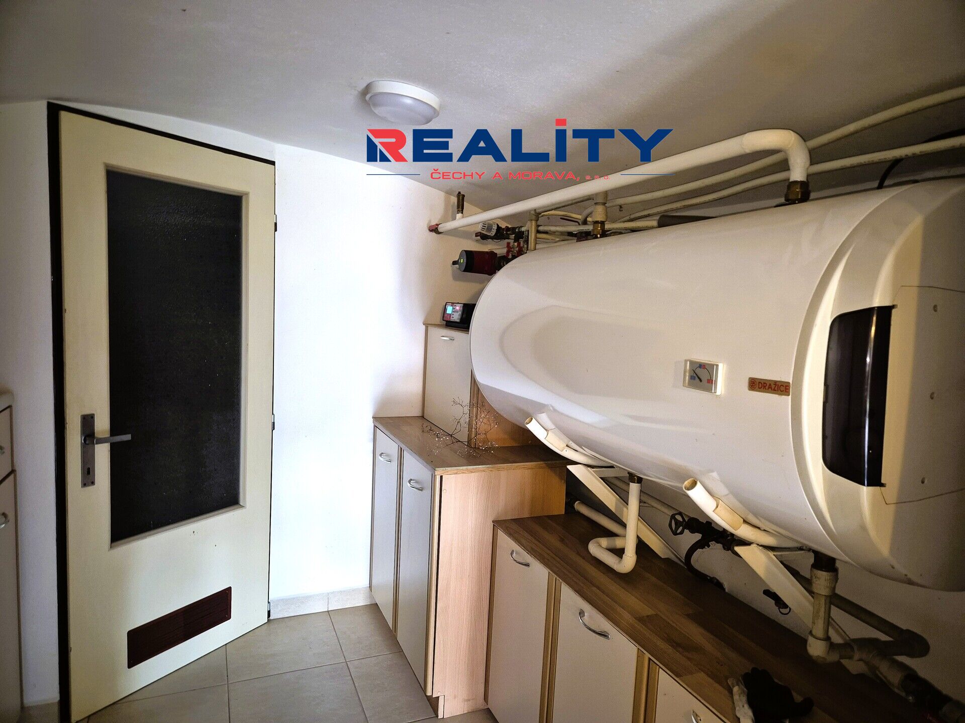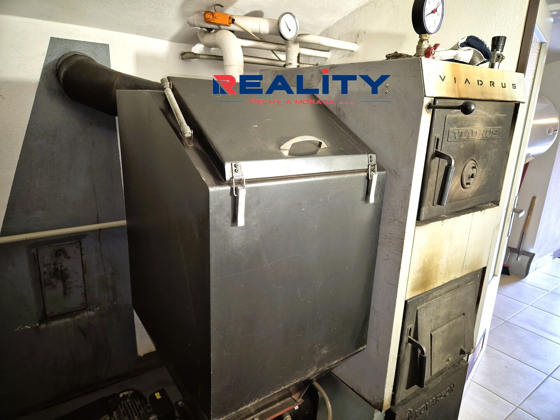 Vytápění je zajištěno automatem s násypkou, ohřev vody elektrickým bojlerem.