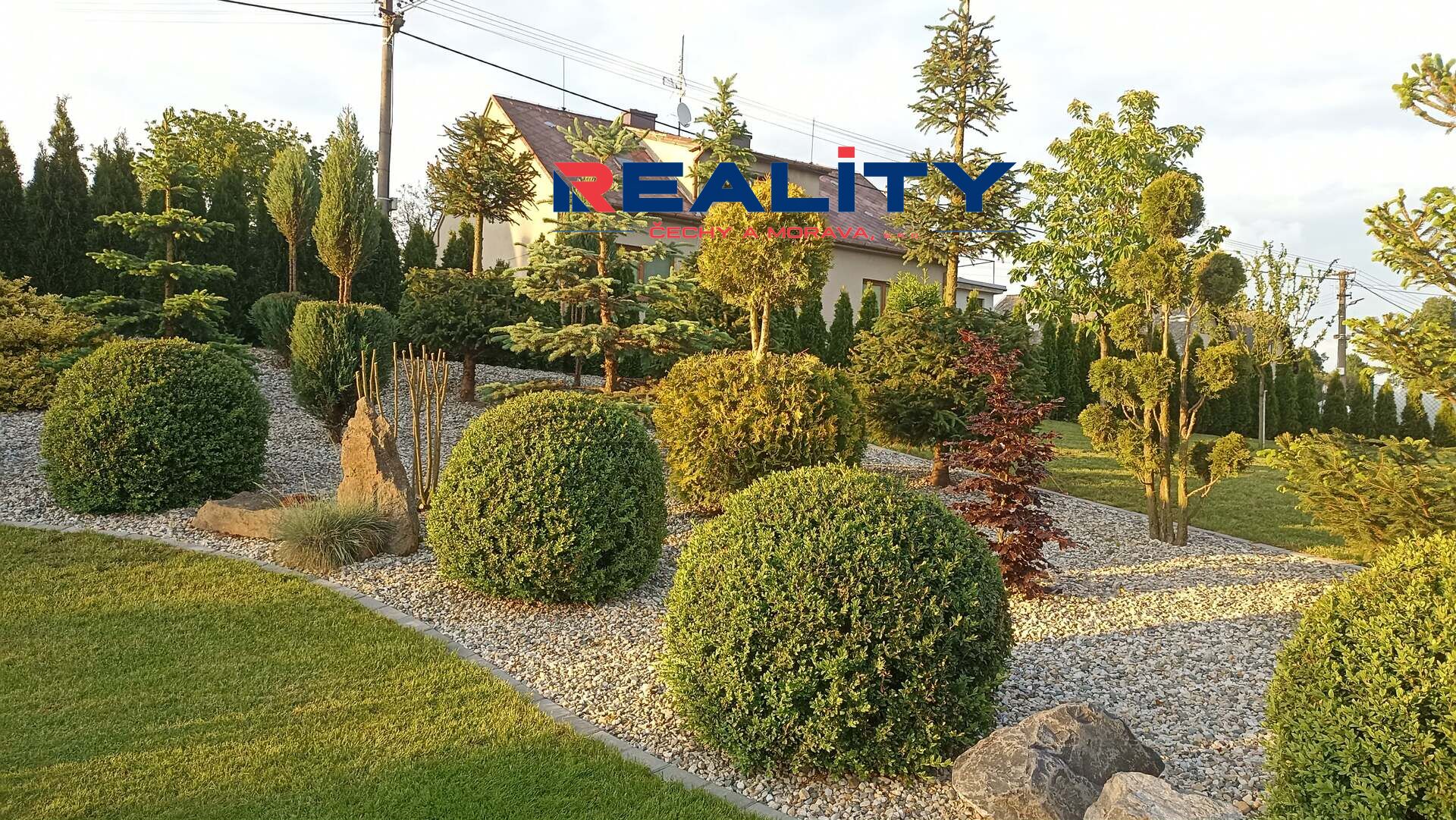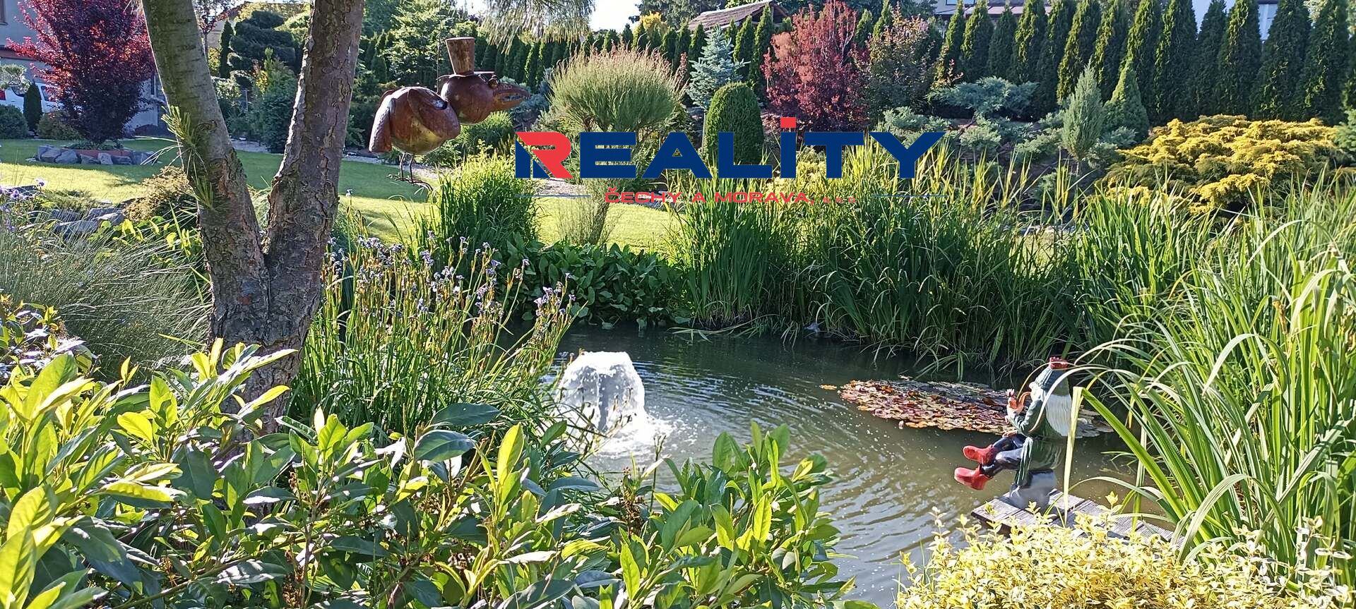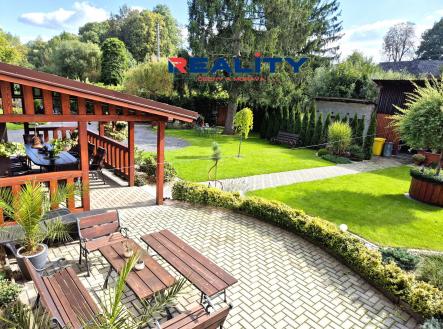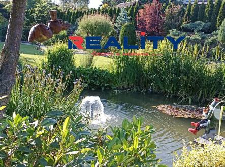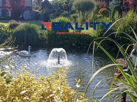 Zahrada o rozloze 1236 m² je rozdělena na okrasnou část s krásnými zákoutími, rybníčkem a fontánkou, a užitkovou část se záhony. Vjezd na pozemek je z boční cesty.