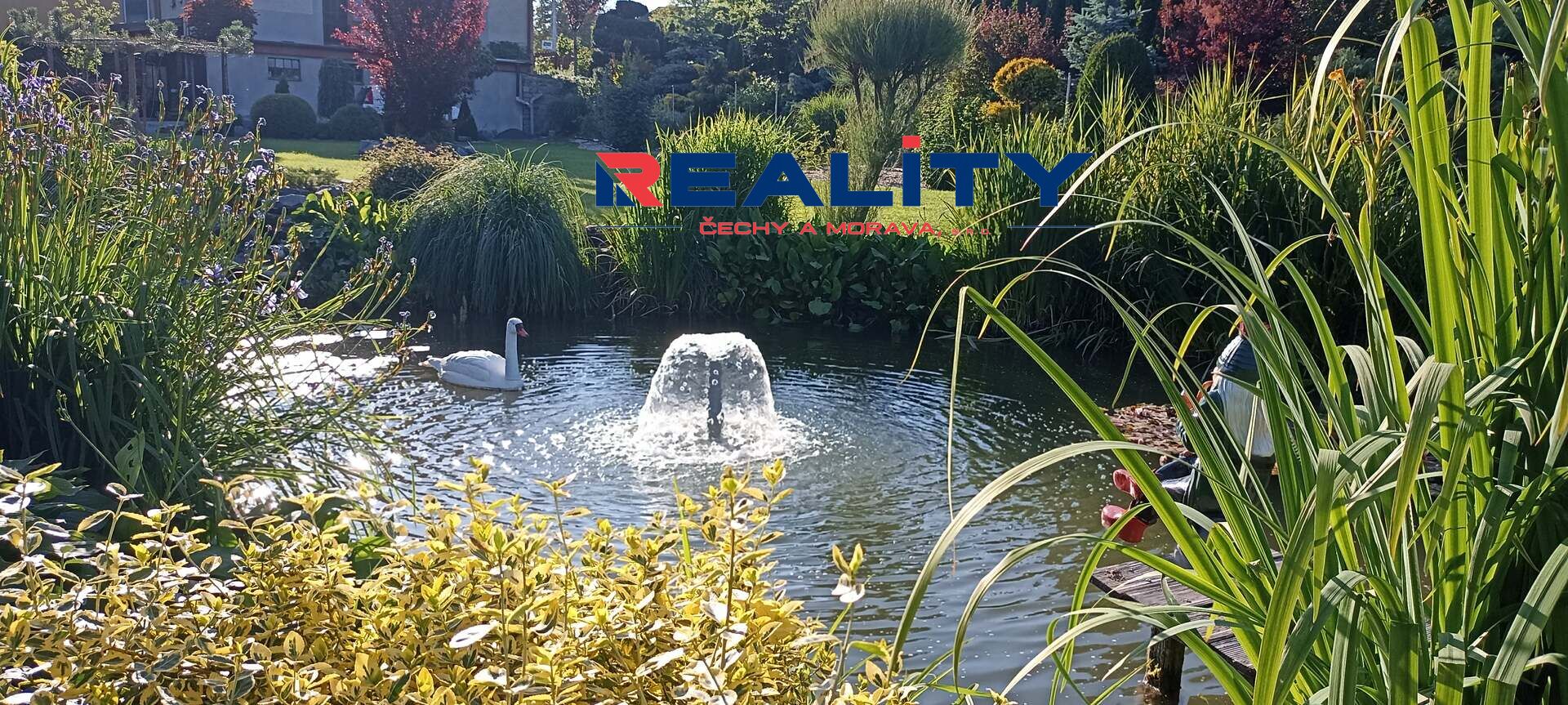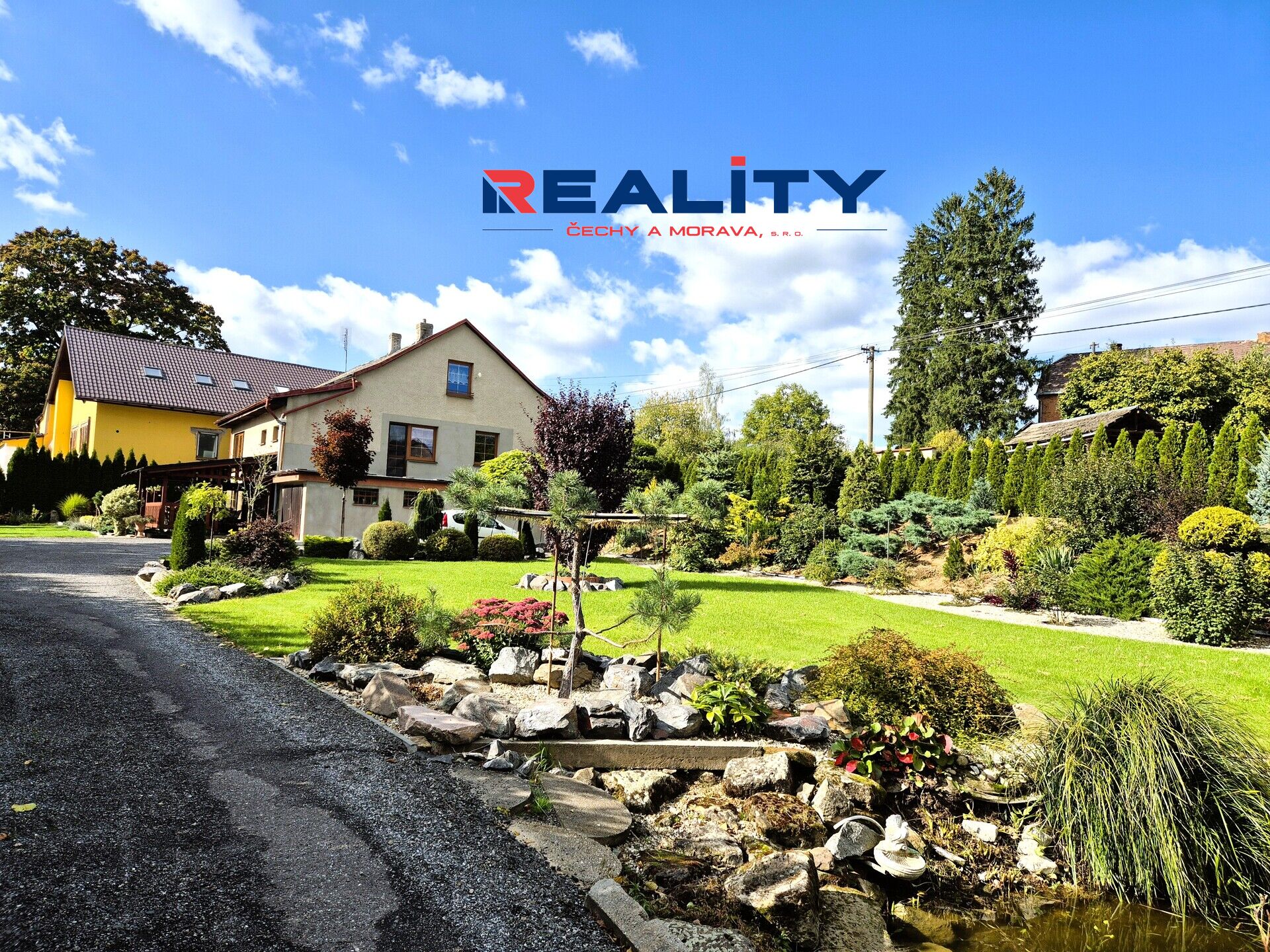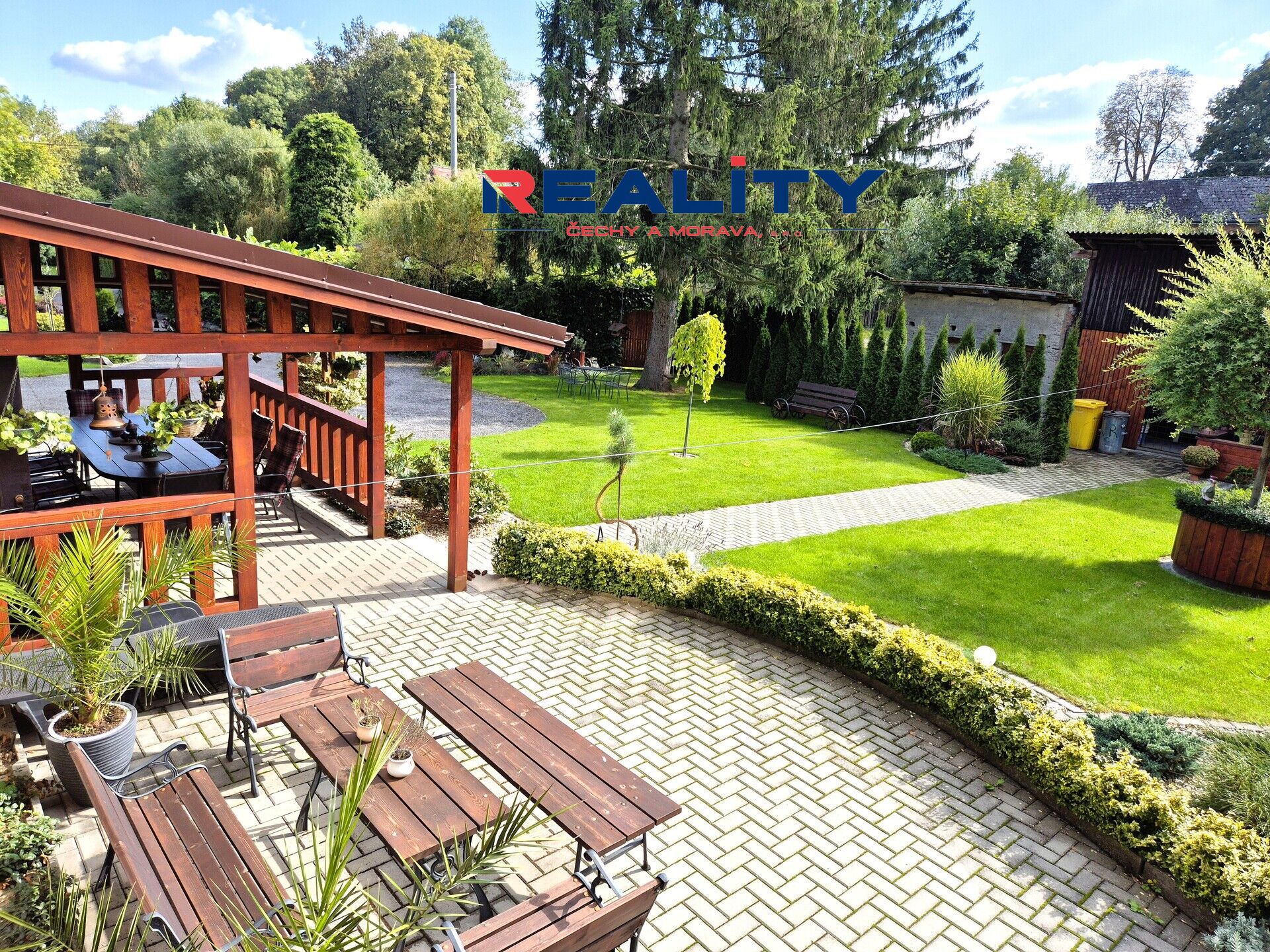 Zahrada o rozloze 1236 m² je rozdělena na okrasnou část s krásnými zákoutími, rybníčkem a fontánkou, a užitkovou část se záhony. Vjezd na pozemek je z boční cesty.